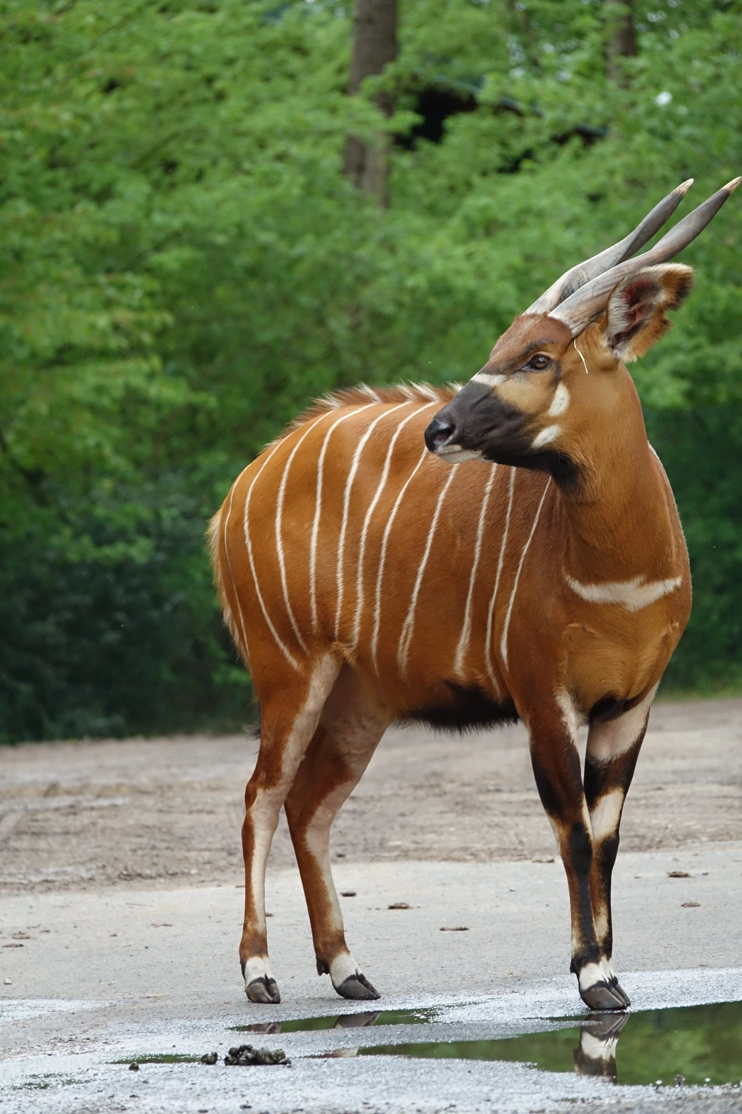 Der Bongo ist eine afrikanische Antilope, die in den dichten Regenwäldern Afrikas lebt. Wie alle Antilopen, wird auch der Bongo, ähnlich wie bei uns Hirsche und Wildschweine, als Fleischlieferant gesehen und bejagt. Mit seinem braunen Fell und weißen Streifen ist er zwar gut getarnt vor Feinden, allerdings kann er sich vor den Menschen mit ihren Fallen und Waffen nur wenig schützen. Deswegen zieht die Antilope sich immer tiefer in die Wälder zurück, wo es kein Kontakt zum Menschen gibt. Allerdings schrumpft sein Lebensraum und durch Wilderei und Jagd, ist der Bestand sehr gefährdet. Sichtungen dieser scheuen Tiere sind selten bis gar nicht möglich. Durch Wildtierkameras und Spuren, wie Trittsiegel und Losung kann der Bestand nur geschätzt werden. Deswegen gelten sie laut IUCN als vom Aussterben bedroht.