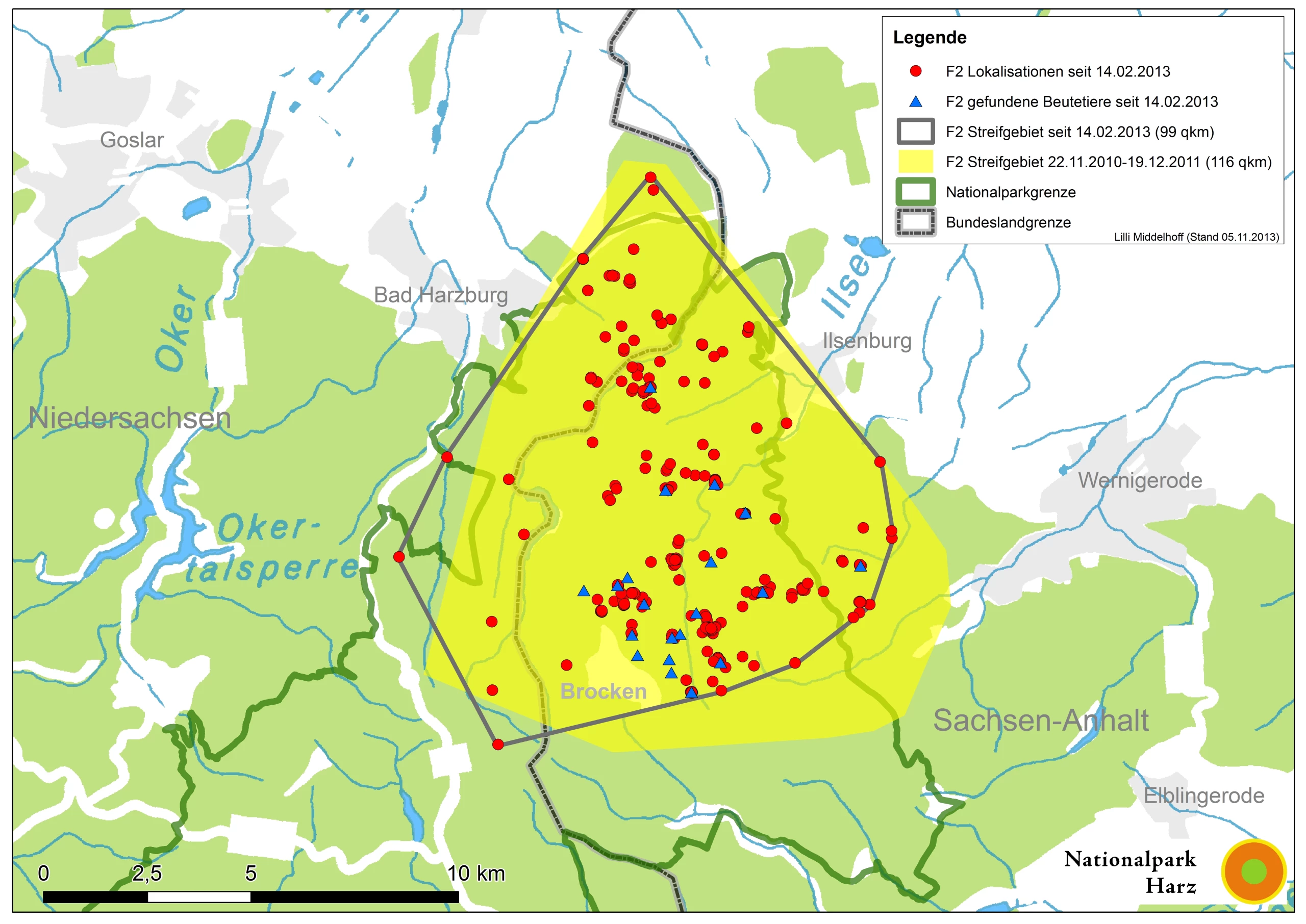Die Serengeti-Park Stiftung spendete dem Luchsprojekt 2013 ein GPS-Halsband. Dieses wurde im Februar einer 19,5 kg schweren Luchsin (F2) angelegt. Bereits im Oktober 2013 konnte F2 mit drei Jungtieren beobachtet werden. Solch ein Senderhalsband ist normalerweise bis zu 13 Monate aktiv, danach löst es sich automatisch vom Hals des Tieres. Leider hatte das Halsband von F2 einen Defekt, so dass keine Daten mehr übermittelt wurden. Im Januar 2014 wurde ein 21 kg schweres Luchsmännchen (M7) gefangen und ein neuer Halsbandsender angelegt. Im Juli konnten dann die ersten Ergebnisse ausgewertet werden: M7 ist ein territoriales Luchsmännchen mit einem festen Streifgebiet. Seine genutzte Fläche ist etwa 120 km2 groß mit einer 50%igen Aufenthaltswahrscheinlichkeit in einem Kerngebiet mit ca. 46 km2. Um noch weitere Informationen über M7 zu erhalten, wurden in seinem Streifgebiet zusätzlich Fotofallen aufgehängt. Damit kann der Gesundheitszustand eines Tieres überprüft und weitere Luchse in seinem Streifgebiet gefunden werden. Zusätzlich werden die Orte abgesucht, so konnten zwei gerissene Beutetiere bzw. deren Überreste gefunden werden: ein Rotwildkalb und ein Reh.